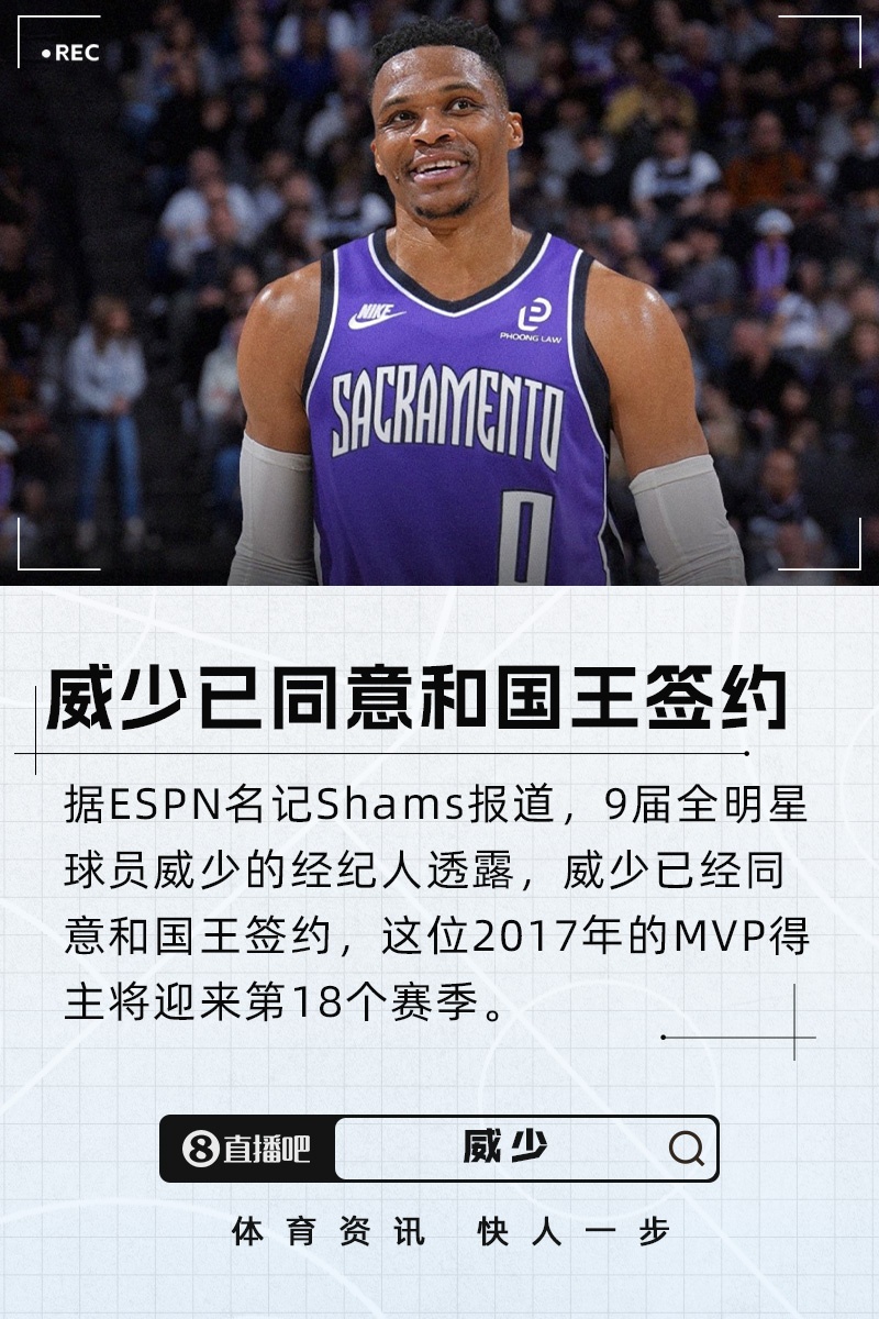 10月15日讯,ESPN记者Shams Charania报道,九届全明星球员拉塞尔-威斯布鲁克(威少)已同意与萨克拉门托国王队签约。其经纪人杰夫·施瓦茨向媒体确认,身为2017年MVP得主的威少,正准备迎接他在NBA的第18个赛季。