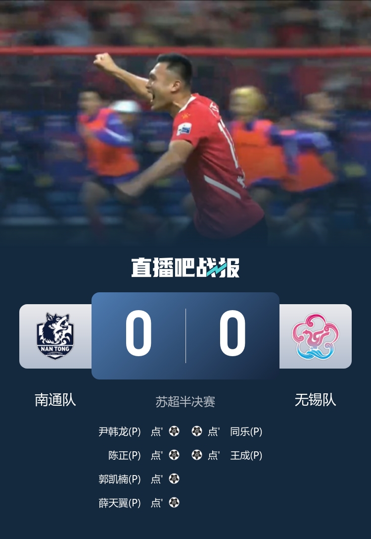 北京时间10月19日19点35分,苏超半决赛在南京奥体中心进行,南通队迎战无锡队。比赛中,上半场,南通队的黄蒋大亚在一次单刀机会中未能把握。进入下半场后,薛天也错失了一次半单刀的良机。经过90分钟的较量,双方均未能改变比分,比赛进入残酷的点球大战。