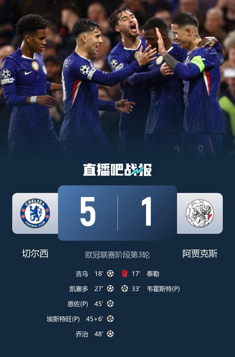 全场比赛结束,切尔西以5-1大胜阿贾克斯,恢复势头。