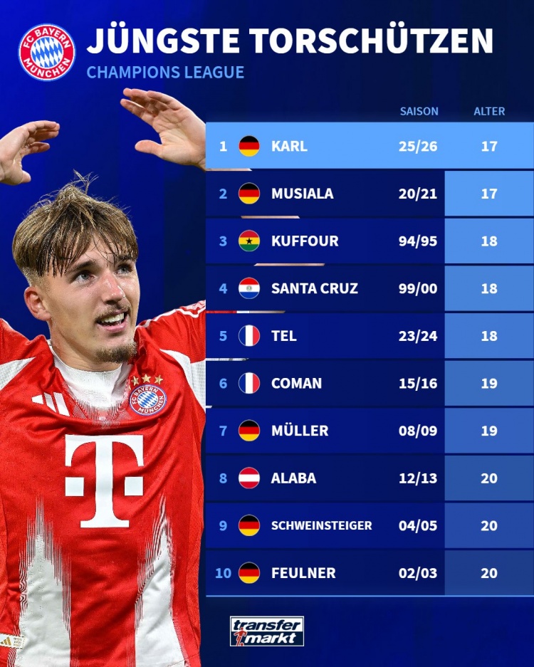 不仅如此,卡尔也成为了欧冠历史上最年轻的德国进球者。在这一领域,他与同龄的穆西亚拉并肩作战,成为同龄人中的佼佼者。他们两人的出色表现,不禁让人对未来的德国足球充满期待。与他们相对的是帕斯拉克和阿德耶米,这两位球员在18岁的时候也为国争光,接下来是德拉克斯勒、萨内、迈尔及里肯等,他们均在19岁时达成进球,展现了德国足球的新生代之力。