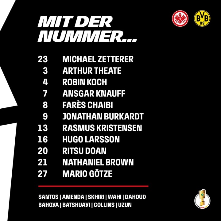 法兰克福的首发阵容以23号的泽特尔把守球门,后防线则由3号泰特、4号科赫以及7号克瑙夫组成,组成了一个坚不可摧的防线。中场方面,脚下技术出众的沙伊比、年轻的伯卡特和拉斯穆斯-克里斯滕森共同构建了球队进攻与防守的平衡。队伍的攻击线则由16号雨果-拉尔森、20号堂安律、21号纳撒尼尔-布朗外加27号格策共同发起强有力的冲击。