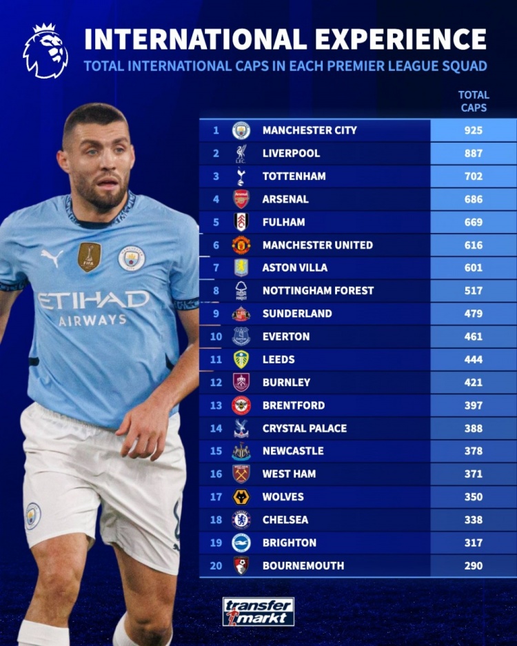根据最新的统计,英超各队球员为各自国家队出战的场次情况引发了大家的关注。令人瞩目的是,曼城的球员在国际赛场上所展现的庞大身影,累积了高达925场出场记录,傲视整个英超,名列第一。而利物浦紧随其后,以887场的成绩紧追不舍,显示出他们在国家队的影响力同样不可小觑。