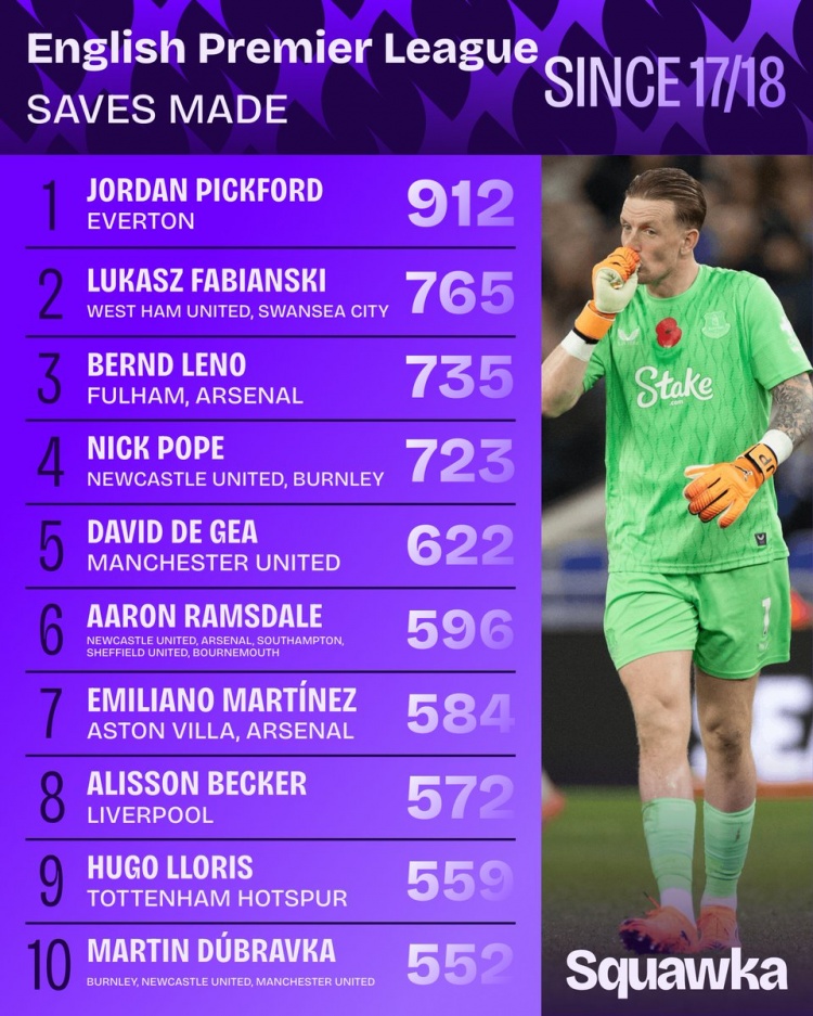 根据Squawka的统计数据,自2017-2018赛季以来,英超联赛中的门将扑救次数中,效力于埃弗顿的皮克福德以912次的扑救次数跻身榜首,而法比安斯基则排名第二,他在西汉姆联和斯旺西期间累计扑救765次。