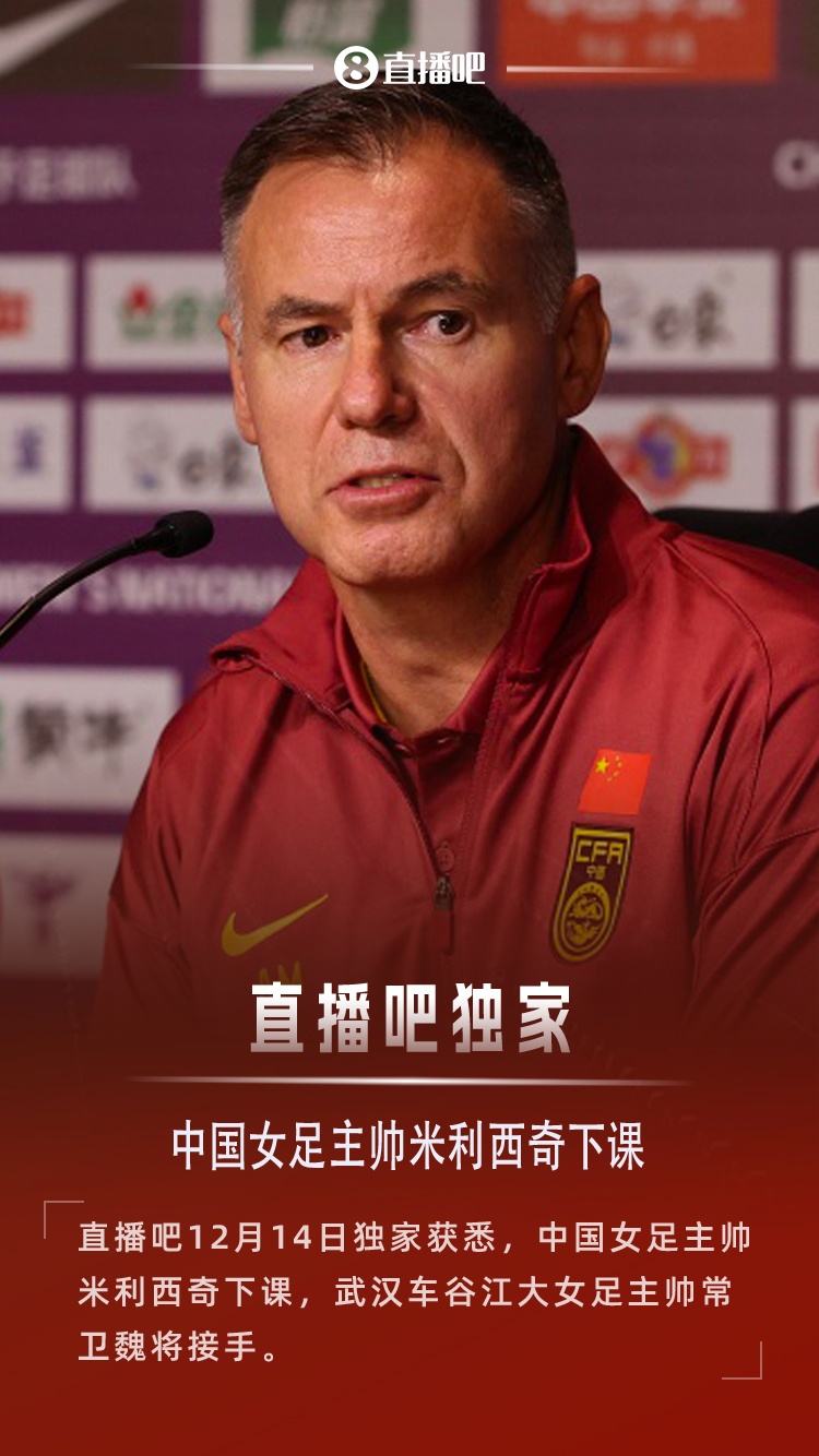 12月14日,消息称中国女足主教练米利西奇被解除职务,接任者为武汉车谷江大女足的教练常卫魏。据说这一人事变动是相关领导的决定。