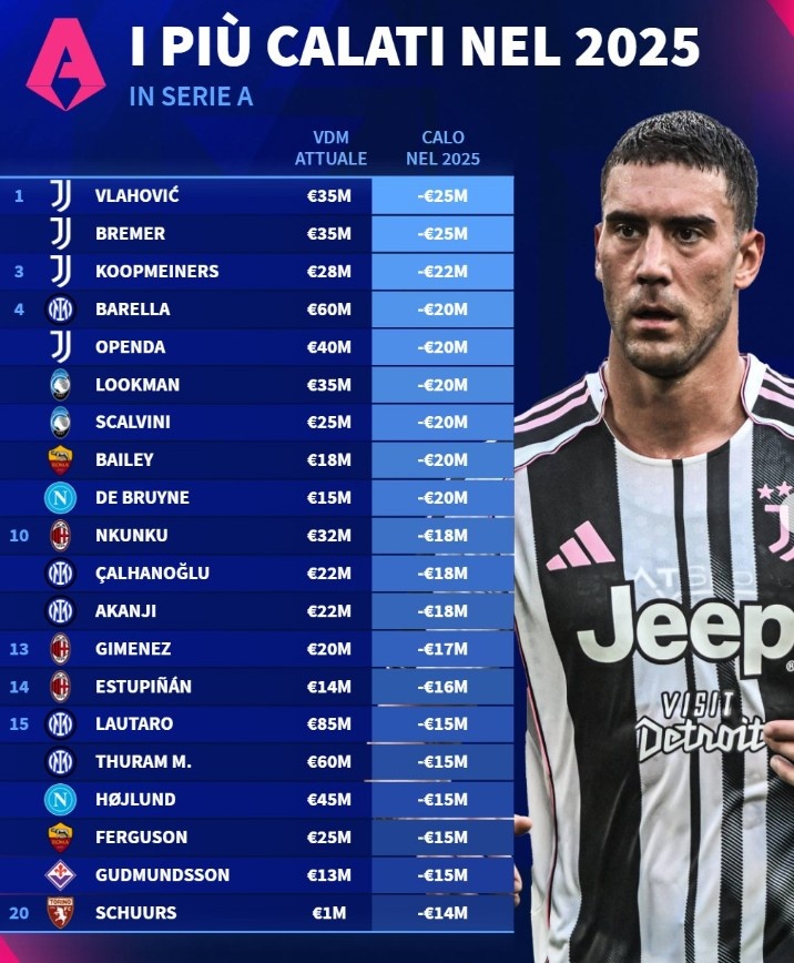 在2025年结束之际,《转会市场》发布了意甲年度身价跌幅的排行榜,其中尤文图斯的弗拉霍维奇和布雷默并列居于榜首,身价分别下降了2500万欧元,现今均为3500万欧元。这个浮动反映了球员在赛季中的表现和市场需求的变化。