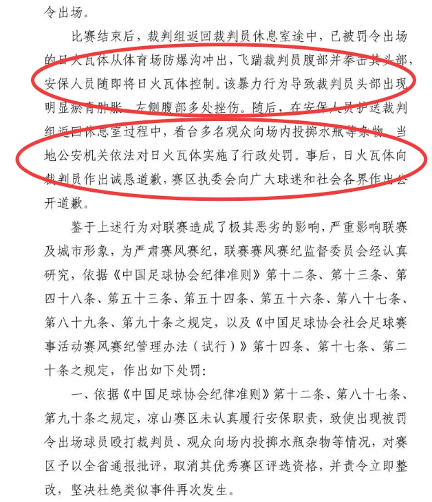 在1月6日的消息中,四川省足球协会在其官方公众号上公布了有关川超球员于11月15日飞踹裁判事件的处罚决策。这个文件的落款时间是12月30日。根据通知所述,受害的裁判员在被凉山队球员日火瓦体踹击后,头部出现了明显的淤青和肿胀,同时左侧腹部也多处挫伤。针对此事件,当地公安机关对此名球员采取了相应的法律措施,进行了行政处罚。