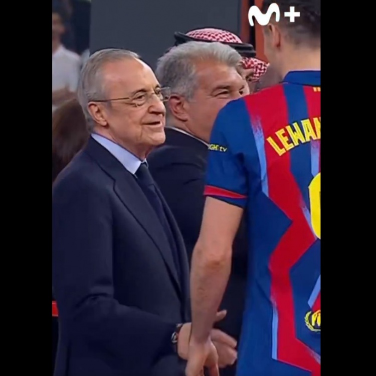 1月13日,西班牙超级杯决赛中,皇家马德里以2-3不敌巴萨,莱万多夫斯基在上半场接到佩德里的直塞助攻,以单刀破门,为球队取得重要进球。在颁奖仪式上,皇马主席弗洛伦蒂诺与莱万进行互动时,展现出复杂的情感。他一边面带微笑向这位波兰前锋致意,一边调侃称其为“混蛋”,以此赞赏其37岁高龄仍能展现出如此高水平的表现。莱万对此表示欣然接受,露出了笑容。