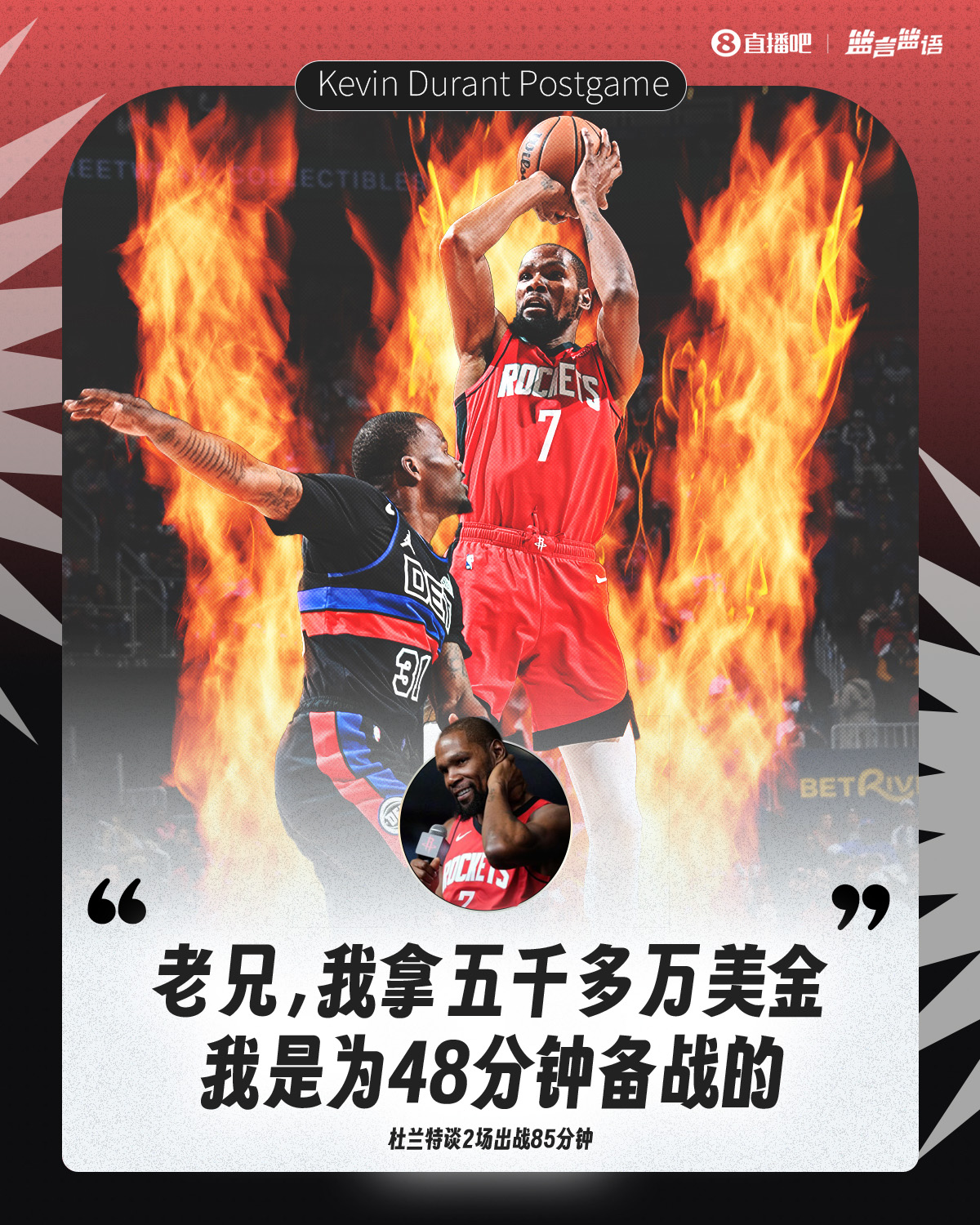 杜兰特在最近的两场背靠背比赛中累积出场85分钟,谈及这段经历时,他表示:“我感觉状态非常不错。这是我作为职业球员应尽的责任,身为一名薪水超过五千万美金的球员,我需要随时准备好上场比赛。当球队需要我的时候,我必须做好充分的准备。”
