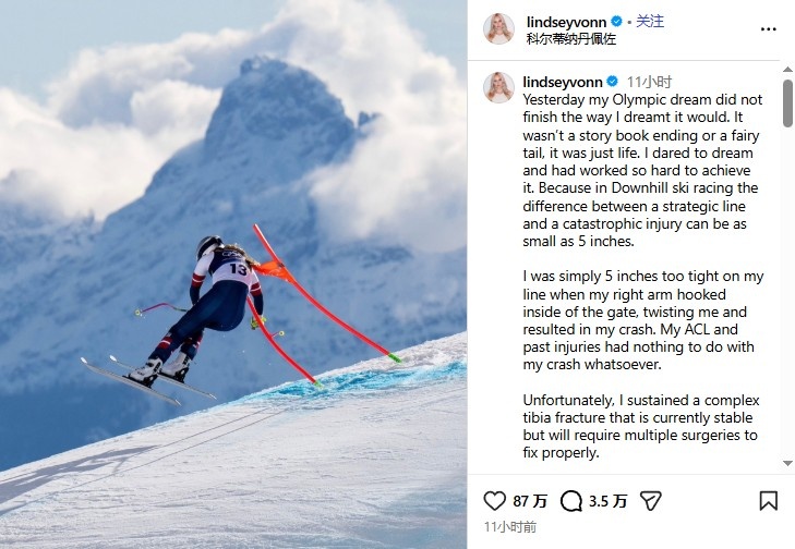 在米兰冬奥会上,美国传奇滑雪选手林赛·沃恩于2月10日的女子滑降比赛中,意外摔倒并重伤,随即被直升机紧急送往医院。经过检查,沃恩被诊断为腿部骨折,并进行了相应的手术,令无数敬仰她的粉丝倍感心痛。