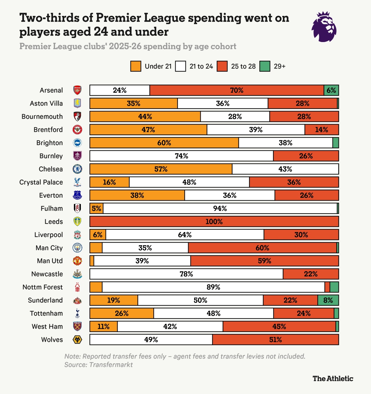 根据TA的统计,今年英超联赛20支球队的总支出超过了35亿英镑(约合47.5亿美元),在这笔巨额资金中,各俱乐部的开支按年龄段进行了详细划分。具体来说,投资流向按年龄划分为四个梯度:21岁以下、21至24岁、25至28岁,以及29岁及以上。数据表明,近一半的资金——49%——投向了21至24岁这个年龄组,成为近年来转会花费的最大赢家,这一趋势已持续了整整八个赛季。
