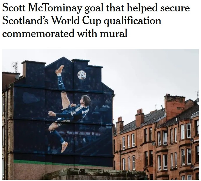 直到阳光照耀的这一刻,苏格兰的历史新章节正在被书写,一个名为麦克托米奈的中场英雄,已经在汉普顿公园的外墙上留下了他划时代的印迹。2月21日,体坛媒体《The Athletic》传来了这则消息:那个在与丹麦对抗的激烈较量中,使用令人屏息的倒钩射门为球队打入首个进球的瞬间,如今以壁画的形式永久铭刻在格拉斯哥这片土地上。28年,这是一段漫长的岁月,苏格兰队终于再次踏上了世界杯的舞台,这场胜利无疑是对时间和努力最好的回报。