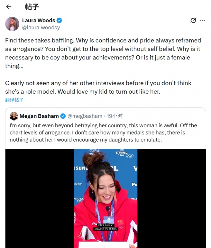 2月25日讯 近日,美国作家兼记者梅根·巴沙姆在社交媒体上分享了一段关于谷爱凌的采访视频,并指出她表现得有些傲慢。对此,TNT著名女主持劳拉·伍兹对此予以了有力的反驳。