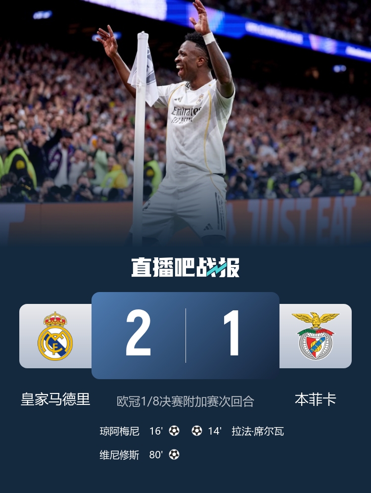 在刚刚结束的欧冠1/8决赛次回合比赛中,皇家马德里在主场伯纳乌以2-1击败本菲卡,总比分3-1顺利晋级16强,将与葡萄牙体育或曼城争夺四强名额。