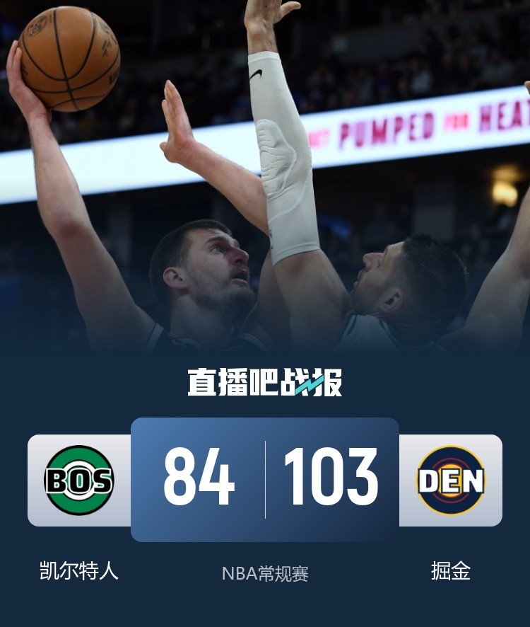 进入下半场,比赛仍然保持紧张局势,掘金突然发力,打出15-0的进攻高潮,迅速建立起两位数的领先优势。凯尔特人在后续的表现中似乎有些乏力,掘金则稳扎稳打,将优势保持到比赛结束。最终,掘金以103-84战胜凯尔特人,在主场顺利拿下这场重要的胜利。