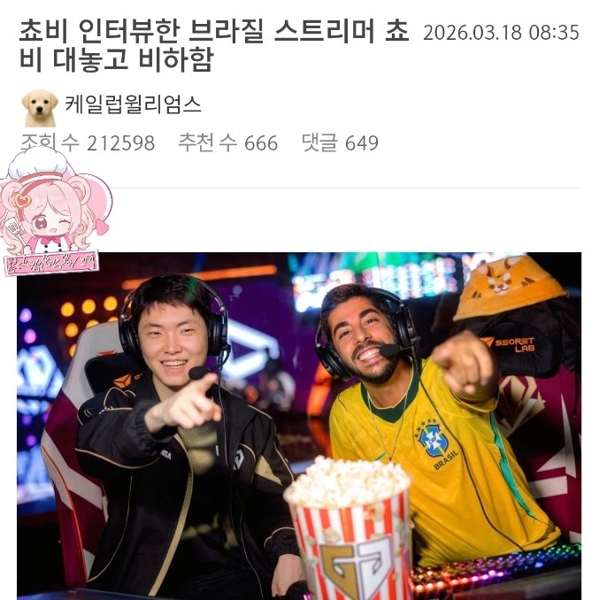 一些韩国网友在社交媒体上发声,称这位巴西主播在采访过程中对Chovy进行了轻蔑的嘲讽。这个Baiano自称是Faker和T1的铁杆粉丝,这本没有什么不妥。然而,令人关注的是,他在采访时旁边摆放了一桶贴着Gen.G队标志的爆米花。