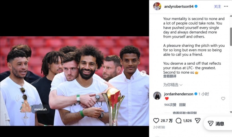 3月25日讯,萨拉赫宣布本赛季结束后将离开利物浦,队友罗伯逊在社交媒体上发表了告别感言。