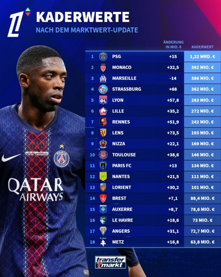 其他俱乐部的表现各异,马赛则由于球队肌体状态的波动,其身价减少了1400万欧元,跌至3.86亿欧元,显示出当前竞争的激烈和不确定性。而斯特拉斯堡的身价增加了6800万欧,达到了3.62亿欧,与此形成鲜明对比,体现出球队在市场中的崛起。里昂和里尔的身价也有所上涨,分别为2.83亿欧元和2.72亿欧元,反映了两队在市场中的稳定性。