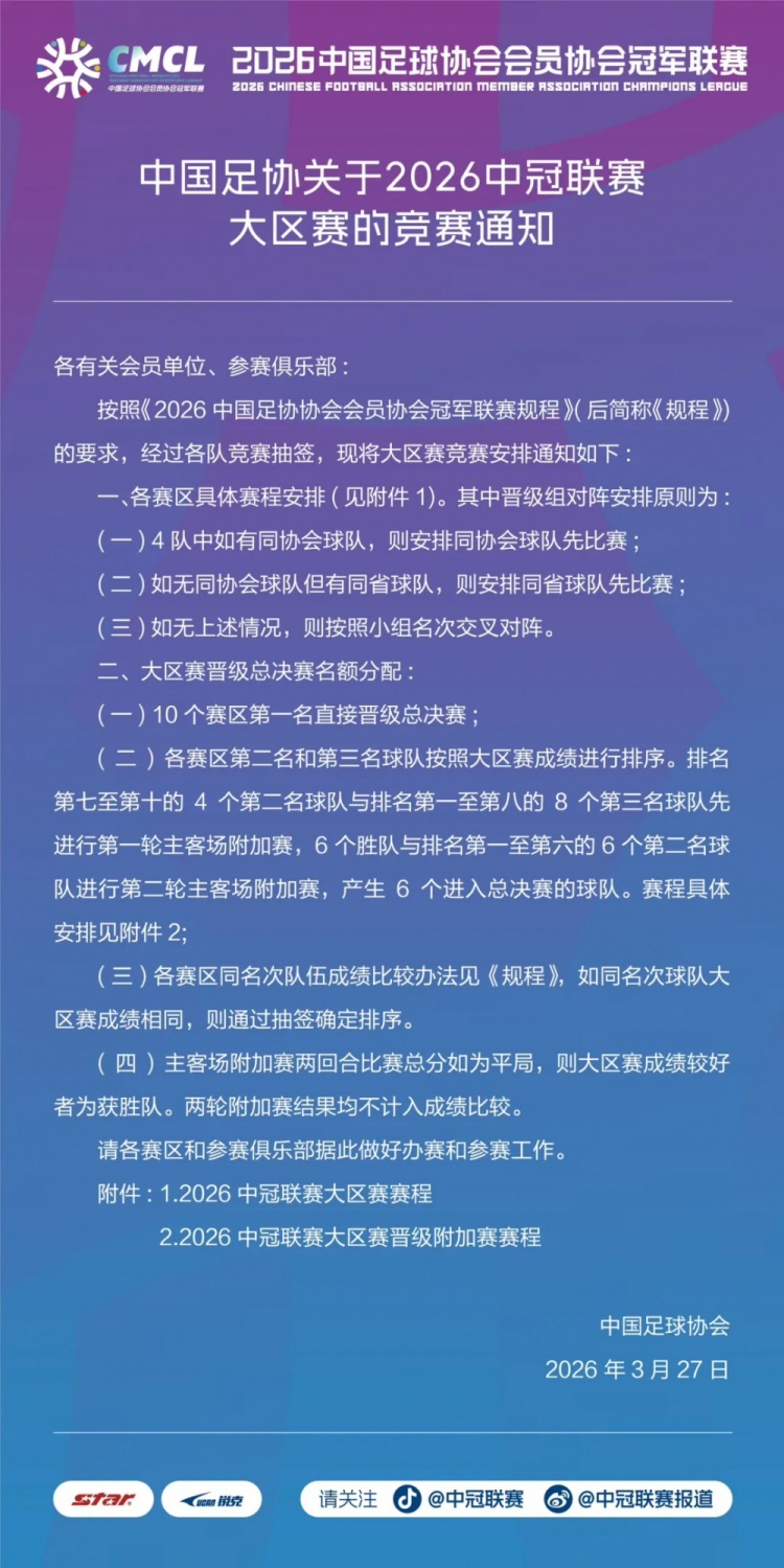 中国足协近日正式发布了2026年中国足球协会冠军联赛大区赛的竞赛通知,指出10个赛区的第一名将直接晋级总决赛。这一措施旨在提升赛事的竞争性和观赏性。