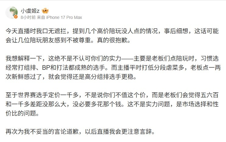 在这次道歉中,小虞姬表示,自己在直播时一时兴起,提到了几位高价陪玩未能得到订单的案例,后来意识到这些话可能会让同行的人感到被轻视。她由衷地感到抱歉,并希望大家能够理解。“我想澄清的是,这绝不代表我对你们的能力有任何怀疑。”小虞姬强调说,问题的根源在于一些店主在选择陪玩时,往往更倾向于那些已经习惯组排、具备一定战术和打法成熟度的选手。