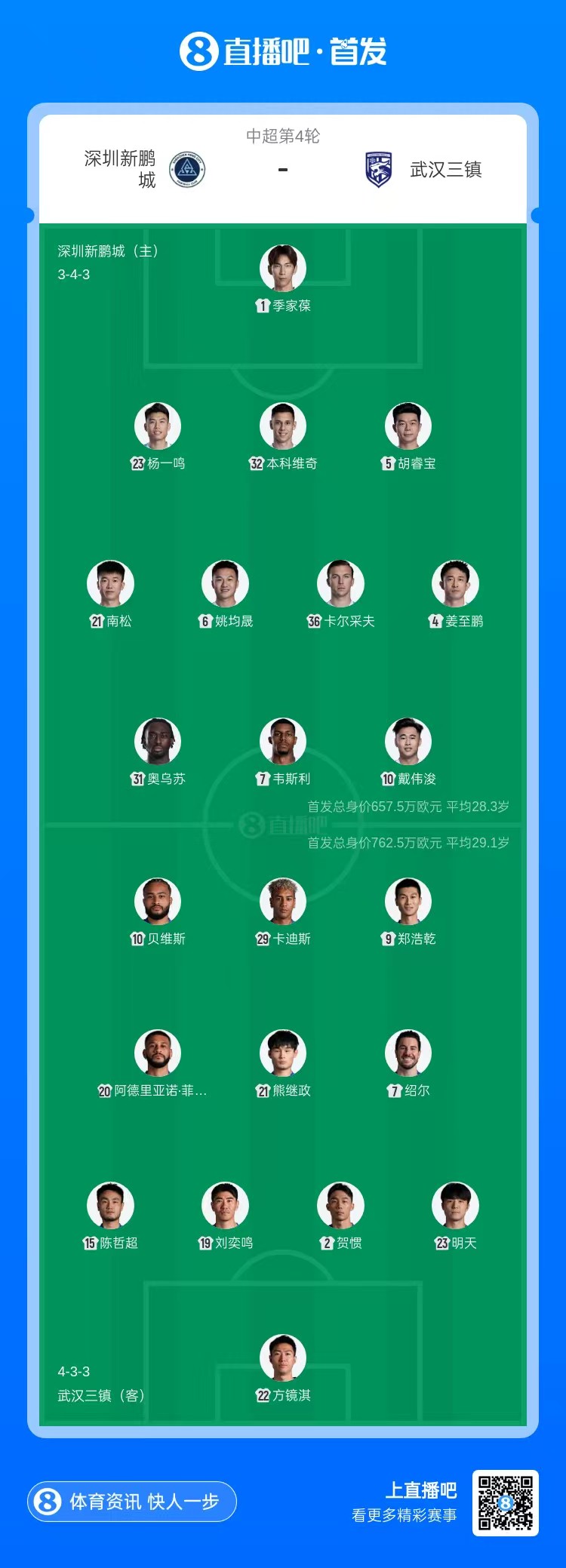 在中超第4轮的比赛中,深圳新鹏城将主场迎战武汉三镇。根据双方公布的首发阵容,深圳队的戴伟浚在经历伤病恢复后迎来了回归并首次首发,周定洋则因感冒而需要替补待命。武汉三镇方面,四名外援卡迪斯、绍尔、阿德里亚诺和贝维斯皆在首发阵容中,这无疑增强了球队的实力。