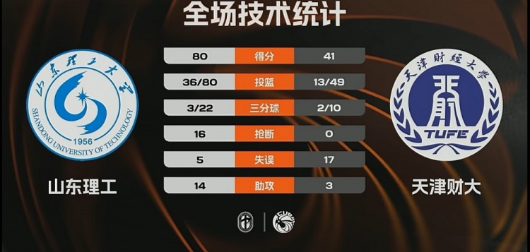 双方的表现数据也很明显。山东理工的王虹发挥出色,拿下25分和5次助攻,马芮莹与邢欣也有贡献,分别得到了15分和13分,展示了球队的整体实力。天津财大的伍和岩得到14分和7个篮板,夏荣更是个人努力,但整体上面临巨大的挑战。