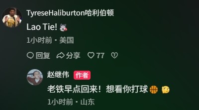 而当哈利伯顿在评论区用“Lao Tie!”回应时,赵继伟如同回应一个久违的朋友,热情地回复:“老铁早点回来!想看你打球。”这波互动看似一团和气,实际上就是在传达着一种隐含的竞争意识:球鞋多么亮眼,但关键还是谁能在赛场上发光发热。