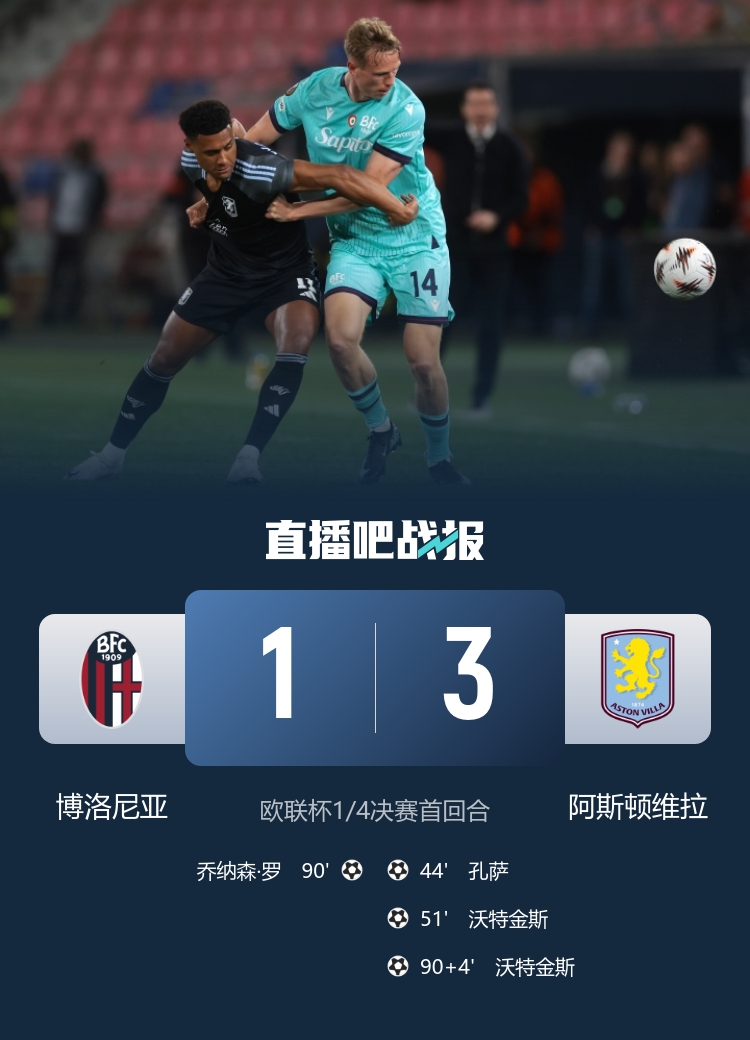 在4月10日的欧联杯1/4决赛首回合中,博洛尼亚在雷纳托·达拉拉球场迎战阿斯顿维拉。比赛上半场,尽管博洛尼亚的进球被取消,但维拉的孔萨利用机会打入首球。下半场,沃特金斯的双响领先了局势,而博洛尼亚的乔纳森·罗也为主队扳回一城。最终,维拉以3-1的比分客场战胜博洛尼亚,为次回合奠定了良好基础。