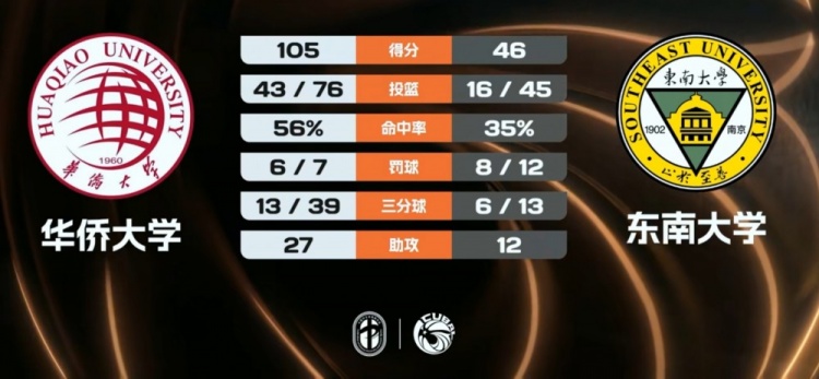 最终,末节比赛中,刘文星的得分和助攻使华侨大学再度扩大分差,虽然东南大学的陈泽茏在努力追赶,但未能改写颓势。华侨大学凭借出色的团队配合和顽强的防守,最终以105-46大胜东南大学,领先59分,展现了强大的实力。